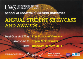 So instead of going where I wanted to go, I ended up going where they wanted me. Which was the University of Glasgow, to do Playwrighting & Dramaturgy. The fact that I’d been awarded Best One Act Play at UWS for The Fandom Menace probably helped swing it…